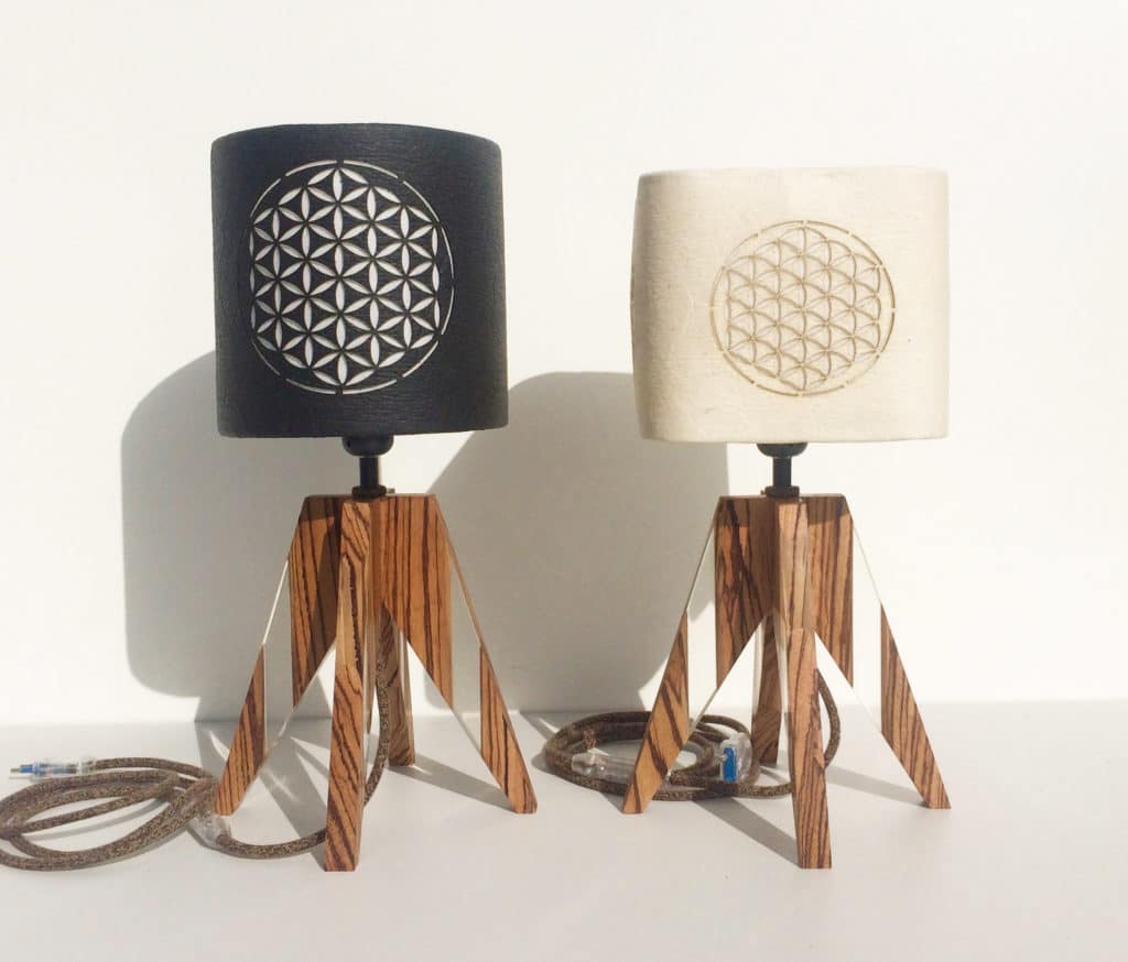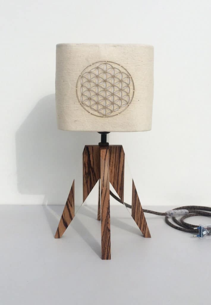 Enfin pour supporter cet abat jour particulier riche en symbole il lui fallait une essence de bois aussi rare que belle. J’ai choisi le Zébrano, une essence exceptionnelle d’Afrique de l’ouest. Ces zébrures d’ou elle tire son nom et sa couleur caramel clair sont elles aussi magiques.