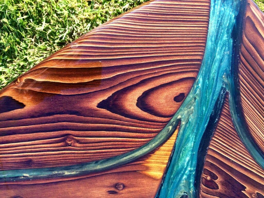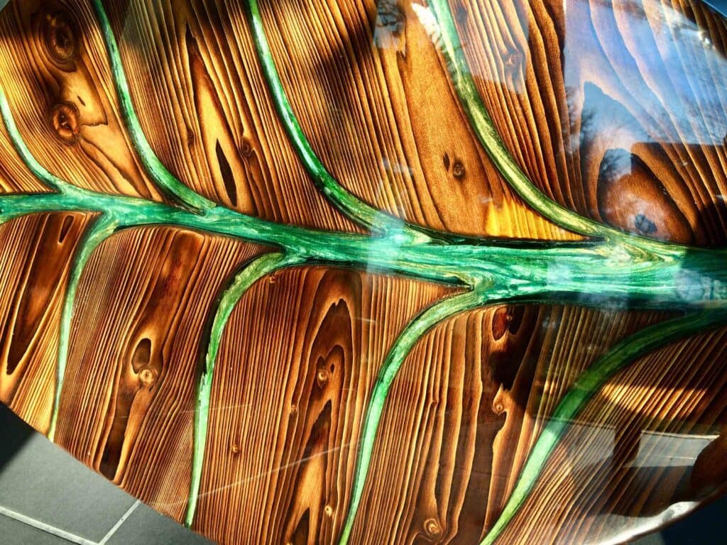 Pour la petite histoire, je n’avais pas l’intention au départ de couvrir totalement la surface de résine. Mais j’y ai été obligé lors du coulage des nervures de la feuille. Finalement, je ne suis pas déçu du résultat, offrant une surface brillante et donnant une grande profondeur au plateau.