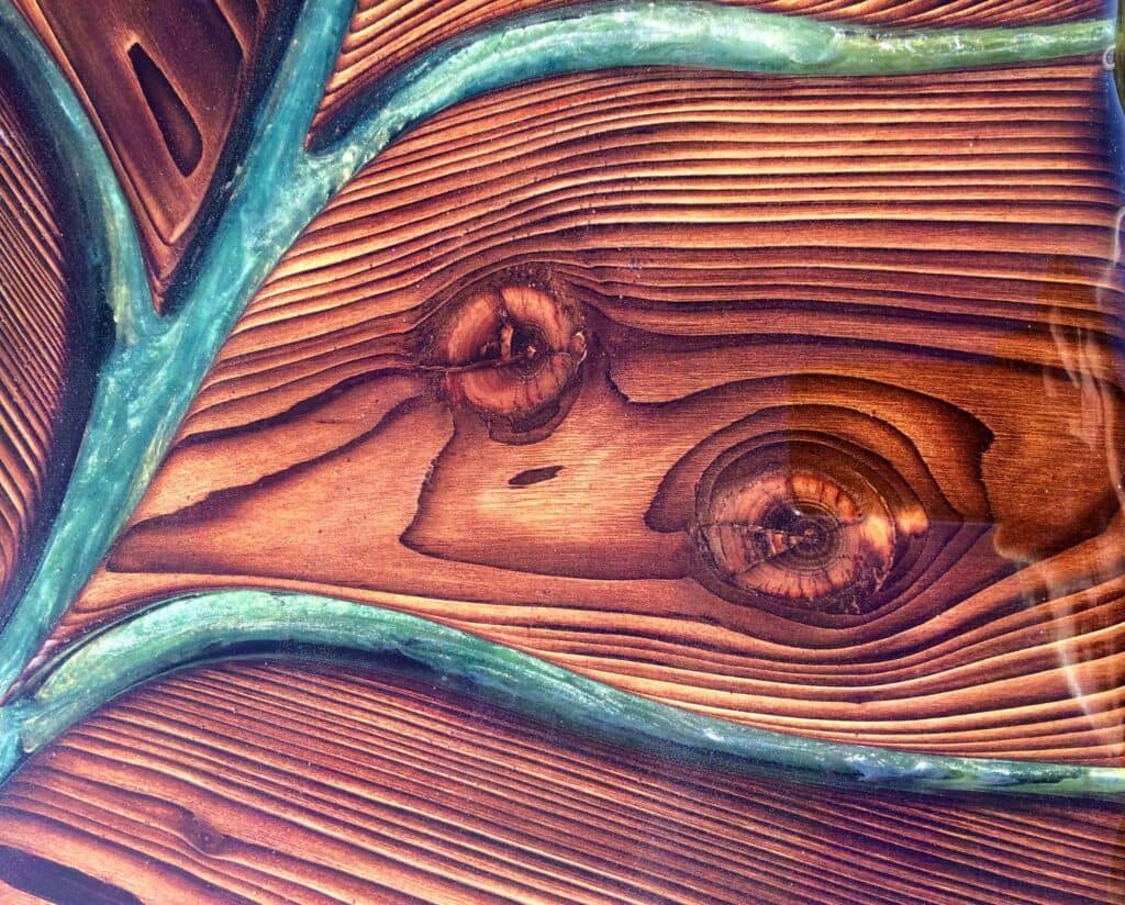 Elle est réalisée avec de l’épicéa en utilisant la technique Japonaise du bois brulé, la technique Shou Sugi Ban. Les nervures de la feuille sont en résine colorées de pigments métalliques de couleurs. En pleine lumière ou au soleil, ces pigments métalliques brilleront de mille feux. Les pieds sont en frêne, un bois blanc noble qui pour ce projet a été lui aussi travaillé à la méthode Shou Sugi Ban. La couleur noire des pieds est naturelle (sans teinte) et le résultat de cette technique ancestrale Japonaise. En le brulant (seulement en surface, sur 1mm), le bois se noircit (et durcit) jusqu’a devenir « noir charbon ». Le bois étant composé de fibres dures et de fibres tendres, cette technique fait apparaitre plus nettement encore les dessins du bois en creusant plus profondément les fibres tendres. Parcourir vos doigts sur ce type de surface est particulièrement agréable et sensuel. Sur des bois blancs et tendres comme l’épicéa, un subtil dosage du brossage permet de faire apparaitre des zones plus claires, révélant des contrastes de couleurs intéressants.