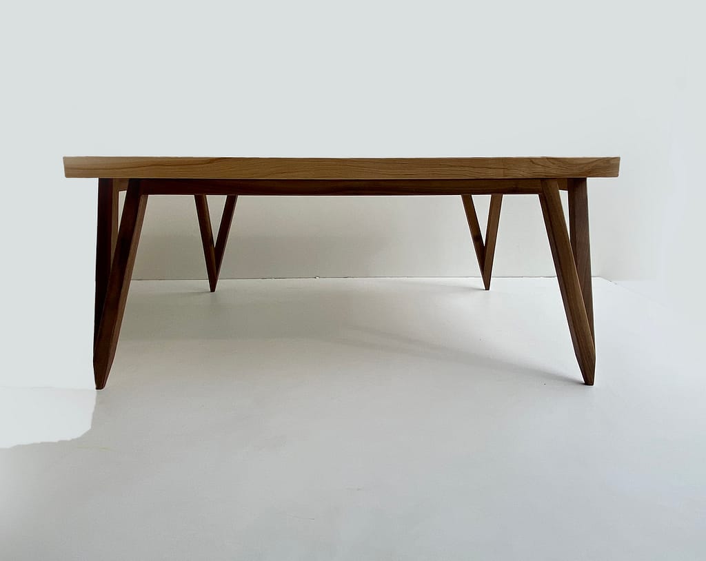 Les dimensions de ce plateau de table sont généreuses : 105 cm X 86 cm, épaisseur 4 cm. De fait cela nécessitait à mon sens un design de piétement lui donnant une impression de légèreté. J’ai utilisé à nouveau le design de piétement que j’avais conçu pour la console « Fixuma ». J’aime énormément ce design de piètement qui tout en étant robuste donne cette impression de suspension et de légèreté. Le piètement est réalisé en noyer massif.