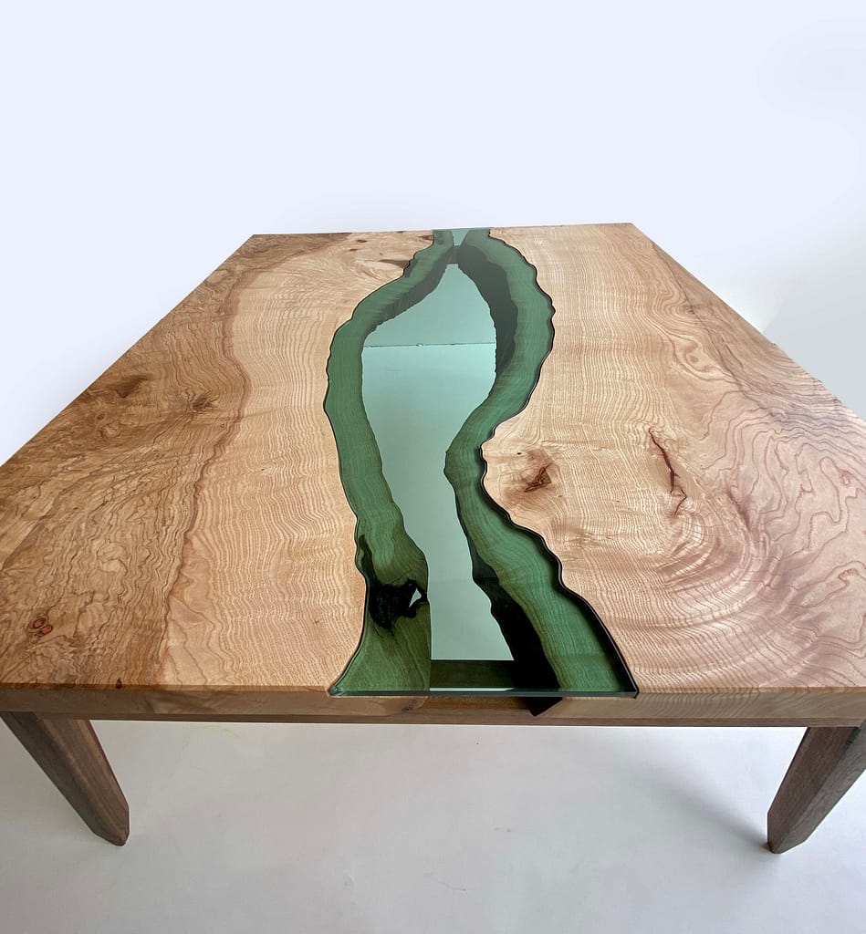 Cette table basse design bois et verre est une version revisité des table basses dites « rivières », intégrant de la résine epoxy.