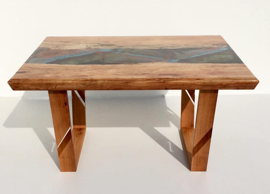 Pour cette table basse en « vieux poirier« , j’ai voulu faire à nouveau une table rivière. Mais cette fois ci en y créant une rivière aux couleurs et au dessin contemporain.