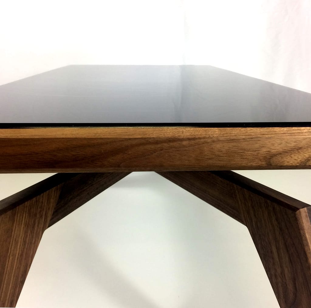 Le plateau de table est lui aussi réalisé en noyer. Cependant sur le dessus du plateau, en l’observant attentivement vous pourrez y voir un quadrillage de placage en hêtre. Avec du recul, je trouvais ce motif de placage un peu trop classique par rapport à l’esprit contemporain de la table. J’ai donc décidé de réaliser une composition personnelle en résine de couleur.
