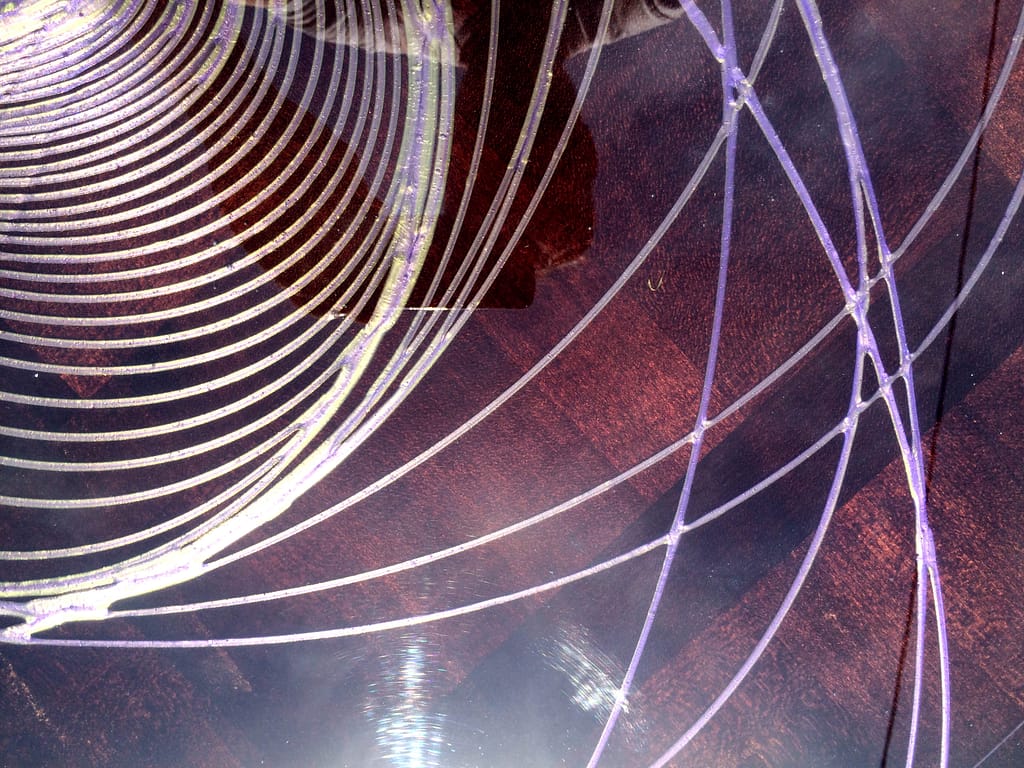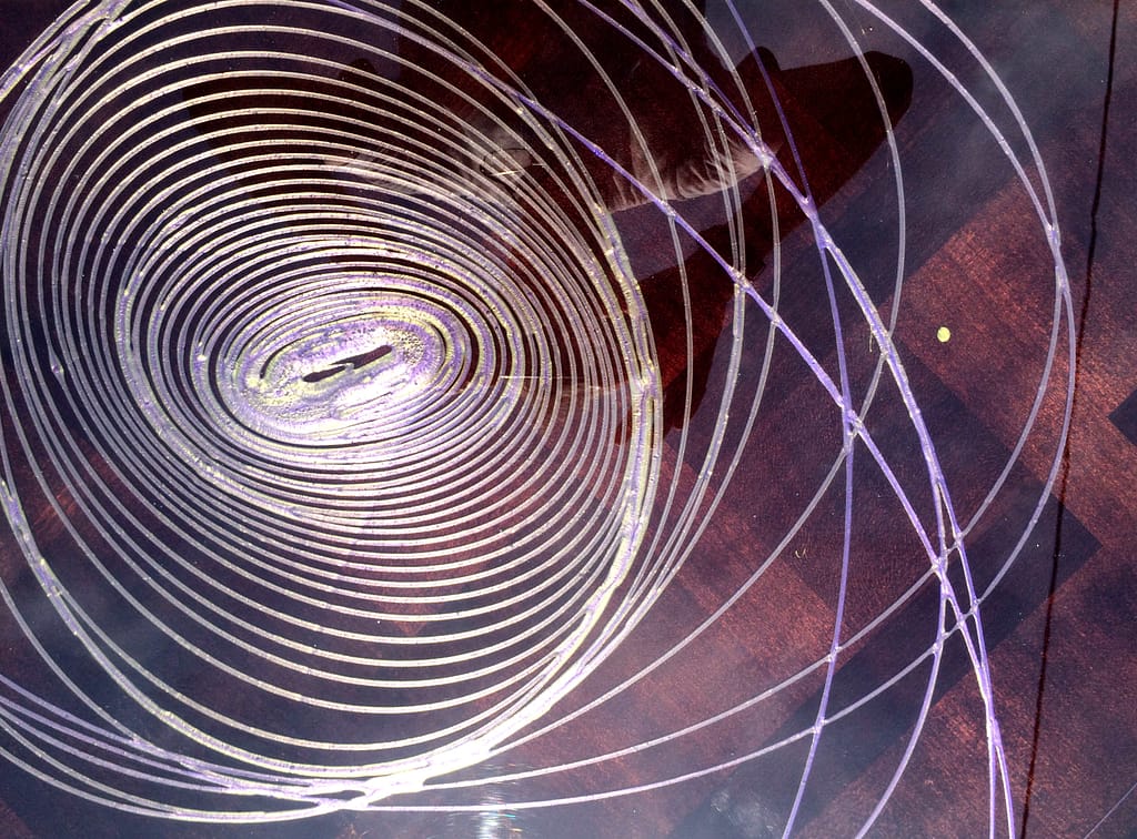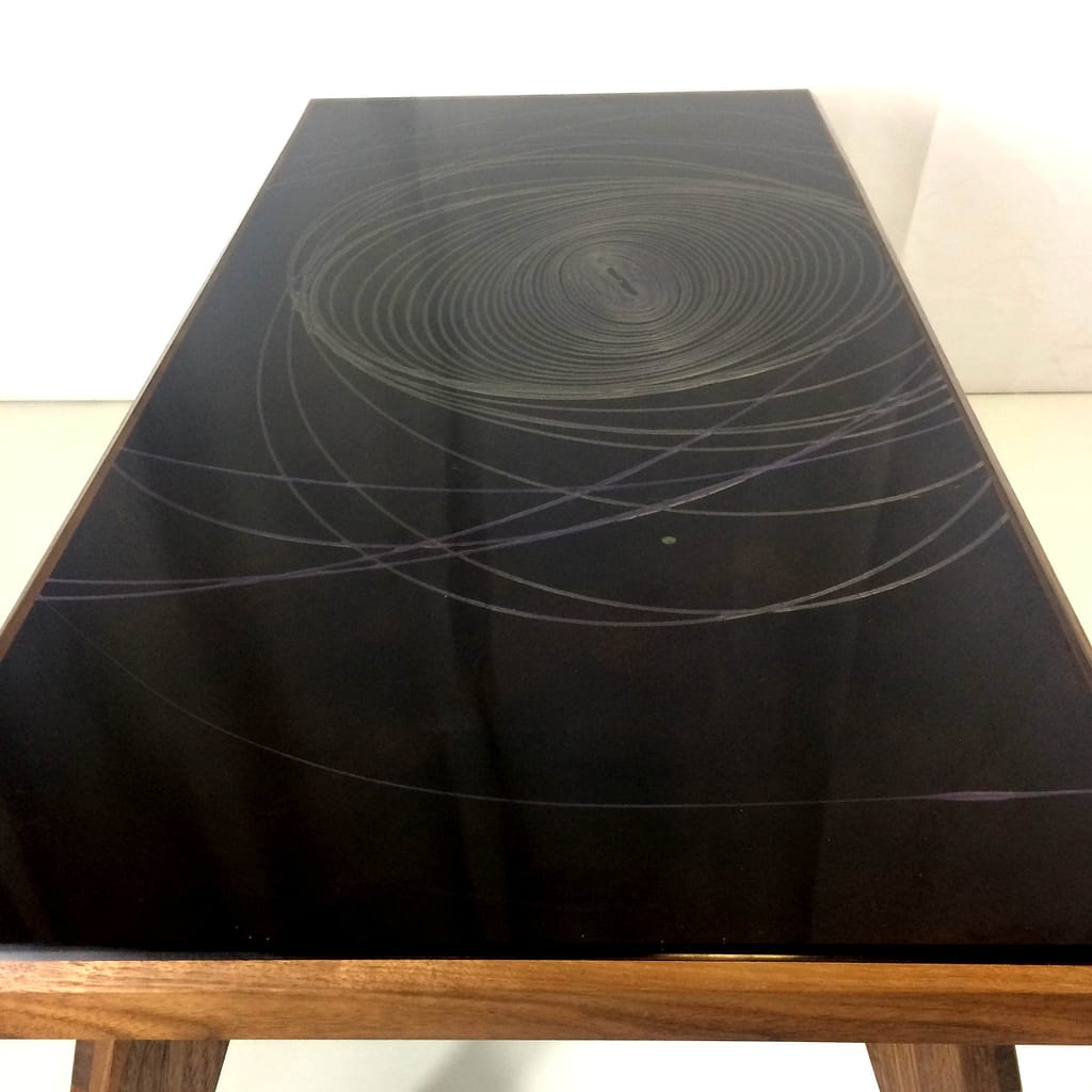 Cette forme elliptique particulière est mon petit secret de fabrication… Pour que cette réalisation tout en courbe soit harmonieuse, la manière de couler la résine de couleur doit être précise. Sur un fond très sombre, j’ai choisi pour ces ellipses au dessin quasi hypnotique, deux couleurs qui se fondent l’une dans l’autre, le vert et le violet. Une tablle basse comme celle ci, installée dans votre salon, ne laissera je l’espère pas indifférents vos invités 😉