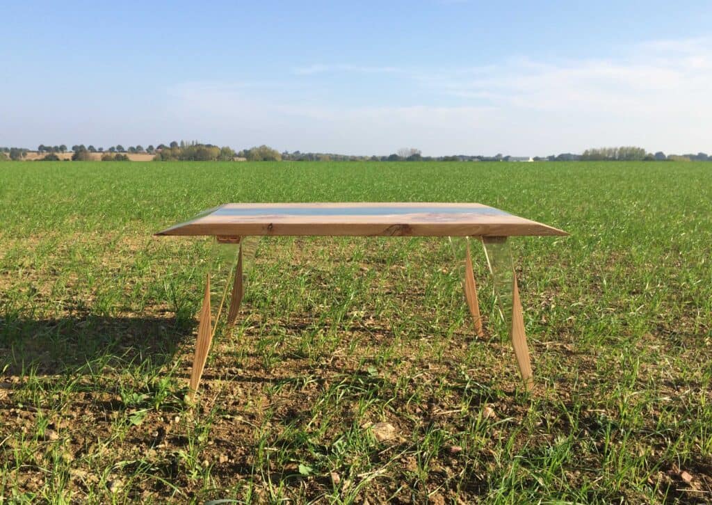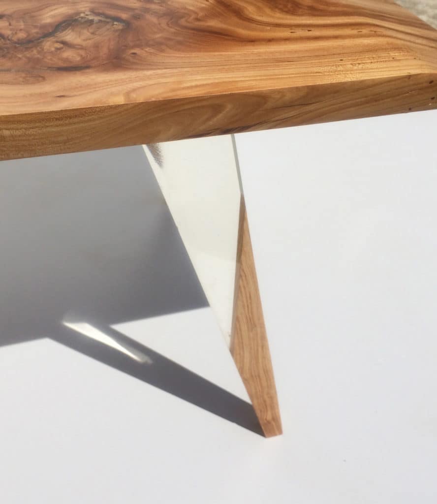 Les pieds réalisés avec du Frêne Olivier et de la résine epoxy donnent l’impression que le plateau de la table est en lévitation sur les quatre « pics » du piétement.